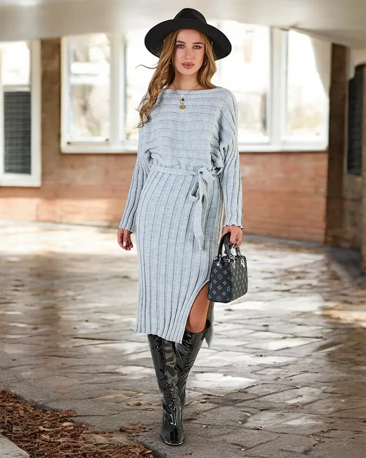 - Női midi pulóver ruha hosszú ujjakkal és kerek nyakkivágással. Ezen kívül övvel a derekán. Must have az idei szezonban! MEGJEGYZÉS: A mérési pontosság (+/-) 1 cm. A méretek laposan mérve.