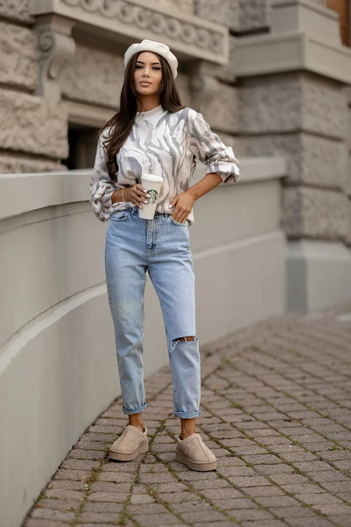 - Kellemes anyagból készült női pulóver kerek nyakkivágással, nyomtatással. A modell hosszú ujjú. Tökéletes alap a téli öltözékekhez!