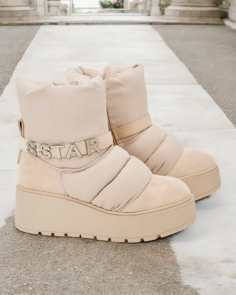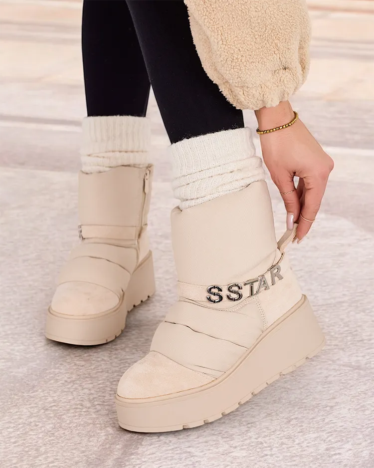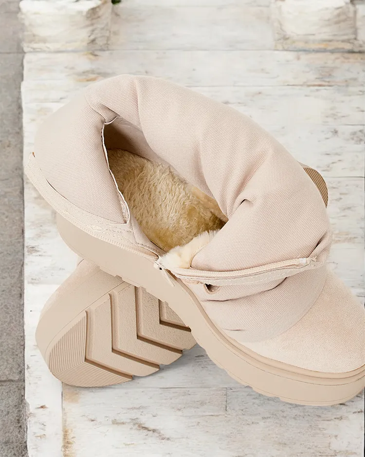 • Női hócsizma, melynek felsőrésze velúr ökobőr és szövet anyag kombinációjából készült. Kellemes szőrmebelső, felsliccelhető és cipzáras lábbeli. Tökéletes választás télre!