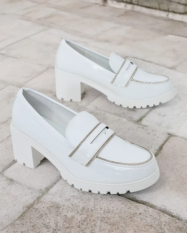 • Klasszikus női mokaszinok sarkúval. A modell lakkbőrből készült, a talpbetét műbőr. A cipőkön diszkrét díszítés található a felső részen, cirkóniákkal. Tökéletes mindennapos használatra!