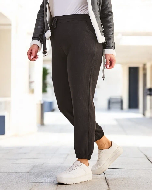 - Időtlen női jogger nadrág, puha, bordázott anyagból készült. Egyszerű szabású modell, két slip zsebbel és állítható derekú húzózárral. Ideális választás mindennapos viseletre!
