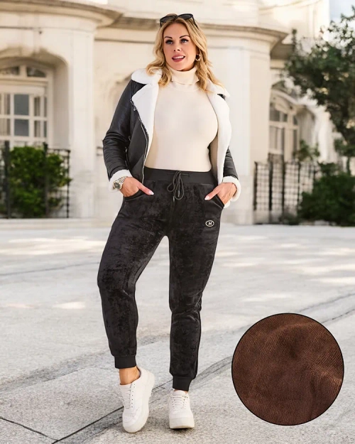- Meleg női melegítő nadrág puha velúr-szerű anyagból készül. Egyszerű szabású modell, két beillesztett zsebbel és rugalmas derékkal húzózsinórral. Belső része meleg polár fleece-ből készült. Tökéletes választás mindennapos viselethez!