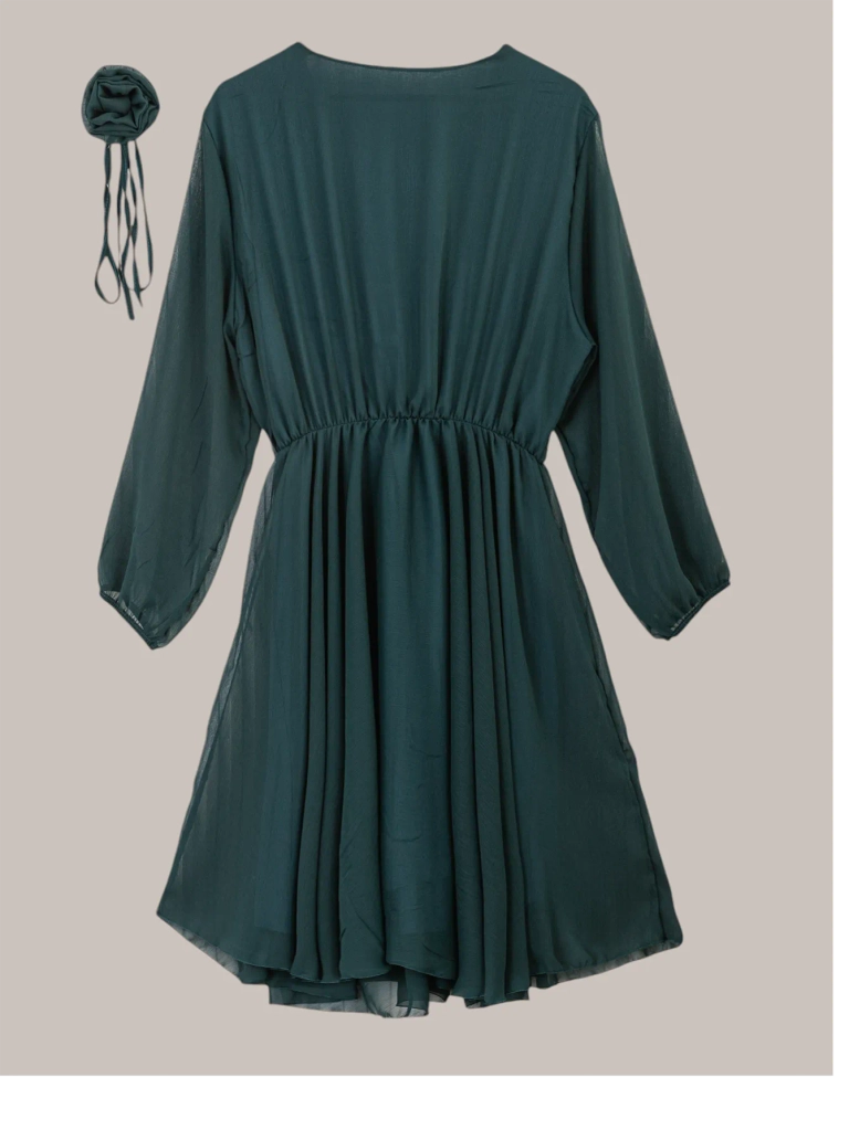 • Elegáns, időtlen térdig érő női ruha csomózott nyakkivágással és rugalmas derékrésszel. A ruhán hosszú ujjú hálós anyag található, valamint egy díszes virággal ellátott pótti. Nagyszerű választás egy esti programra!