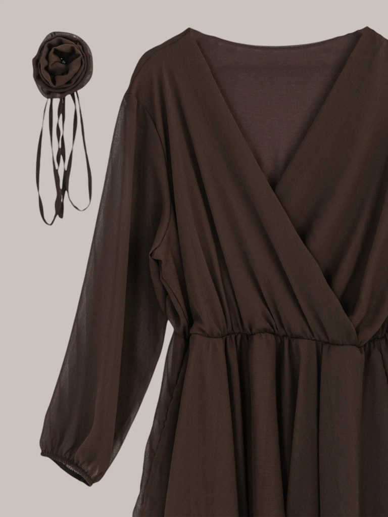 • Elegáns, időtlen térdig érő női ruha csomózott nyakkivágással és rugalmas derékrésszel. A ruhán hosszú ujjú hálós anyag található, valamint egy díszes virággal ellátott pótti. Nagyszerű választás egy esti programra!