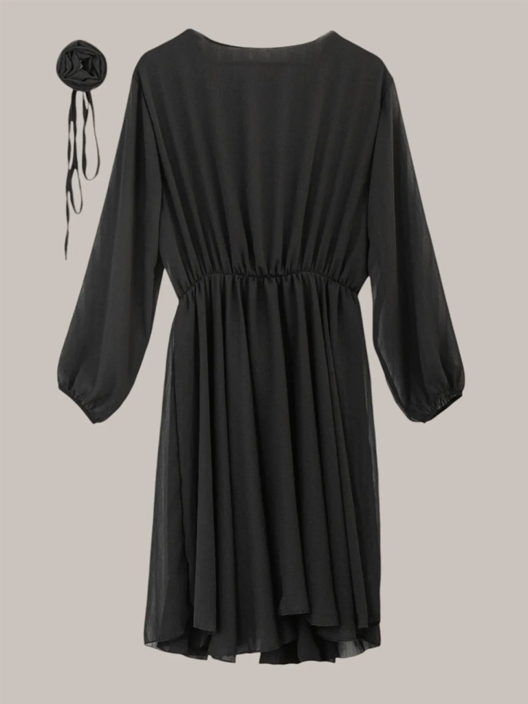 - Elegáns, időtlen női térdig érő ruha, melyben csomagolós nyakkivágás és elasztikus derékrész található. A ruhán hosszú ujjak találhatók hálóból készült anyagból és egy dekoratív kiegészítő hajóval virággal. Kiváló választás az estére!