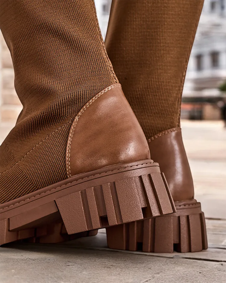 • Divatos női combig érő csizmák vastagabb talppal. A felső rész rugalmas anyagból készült, melyet öko bőr betétekkel egészítettek ki, belül textil talpbetéttel. Belebújós modell. Ideális mindennapos őszi outfithez!