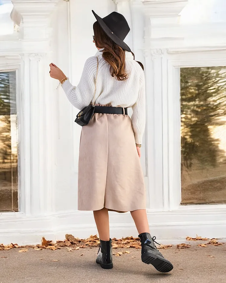 • Női midi szoknya puha anyagból, mint a suede. A modell övekkel érkezik. Ideális alap páratlan öltözékekhez! FIGYELEM: Méret pontosság (+/-) 1 cm.