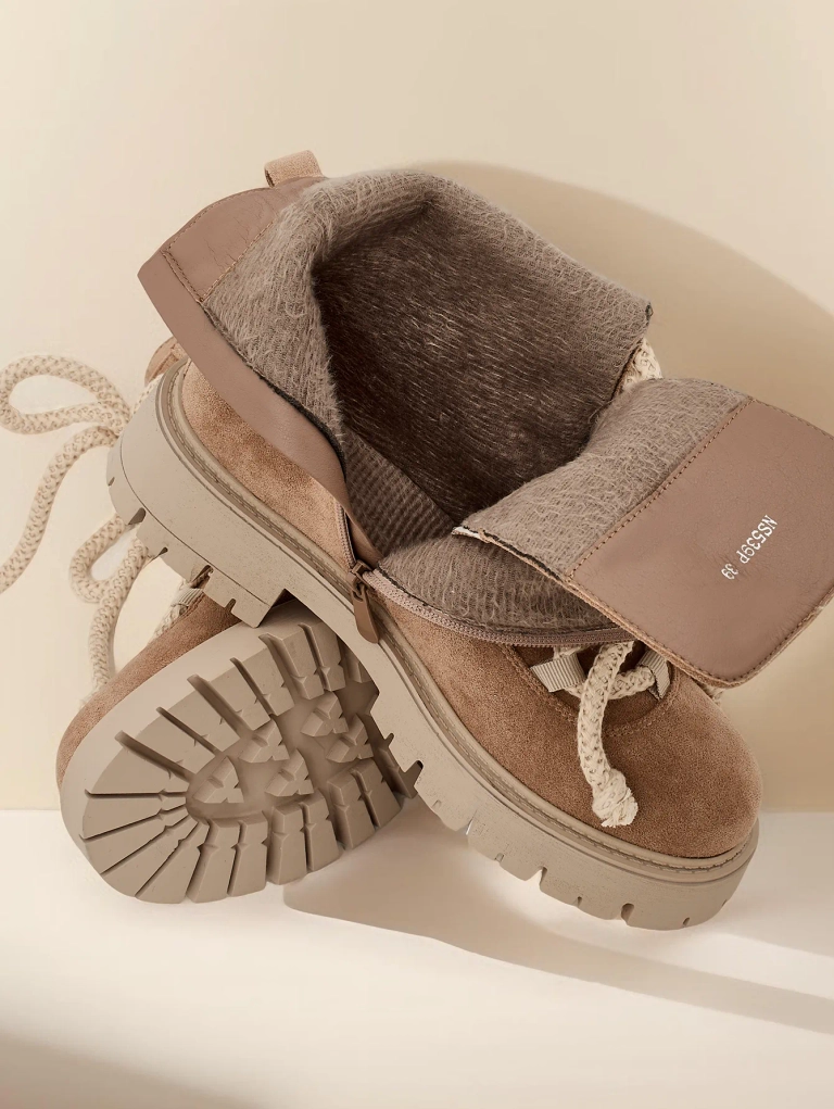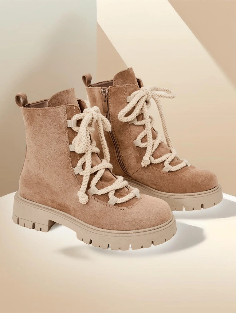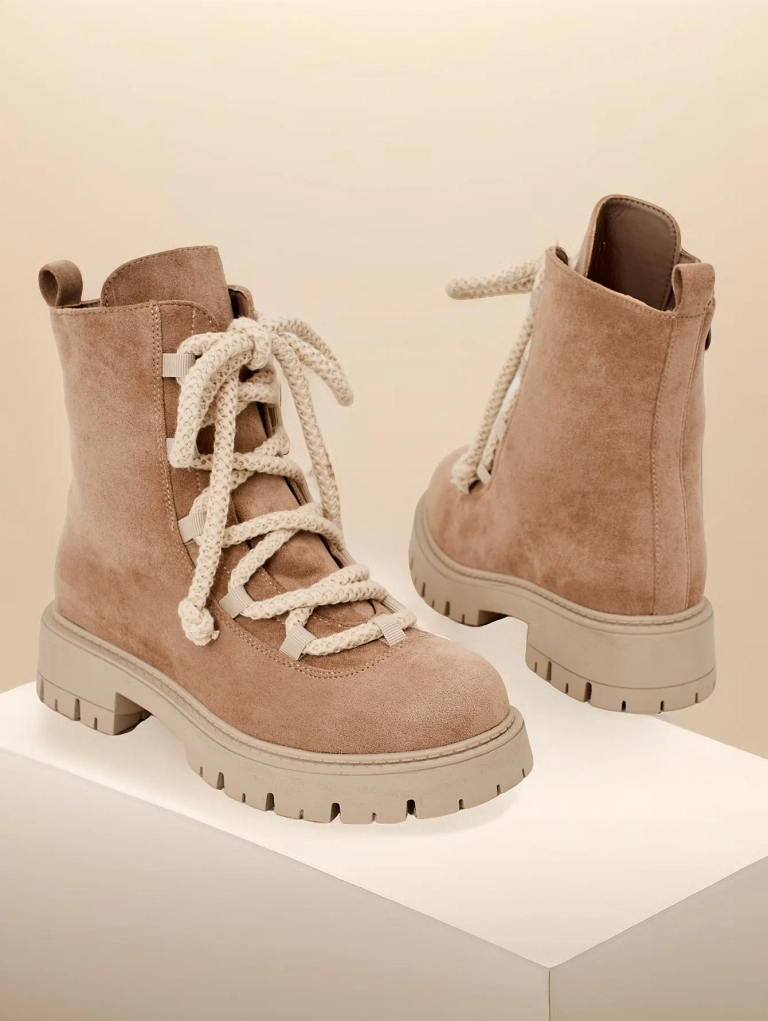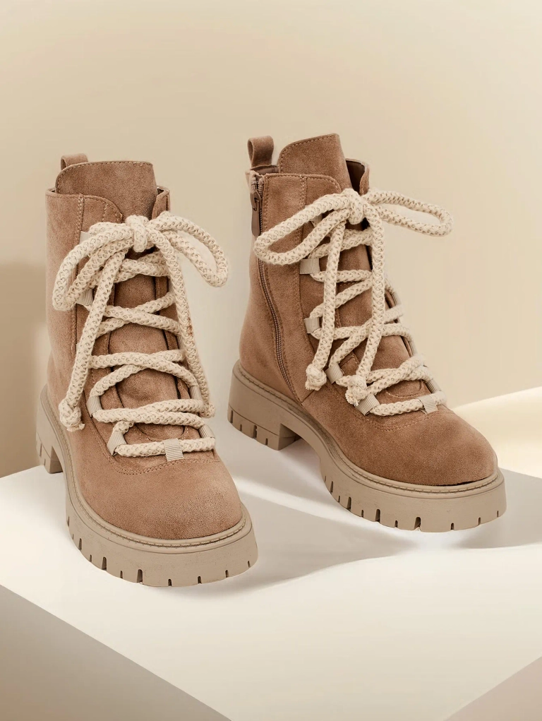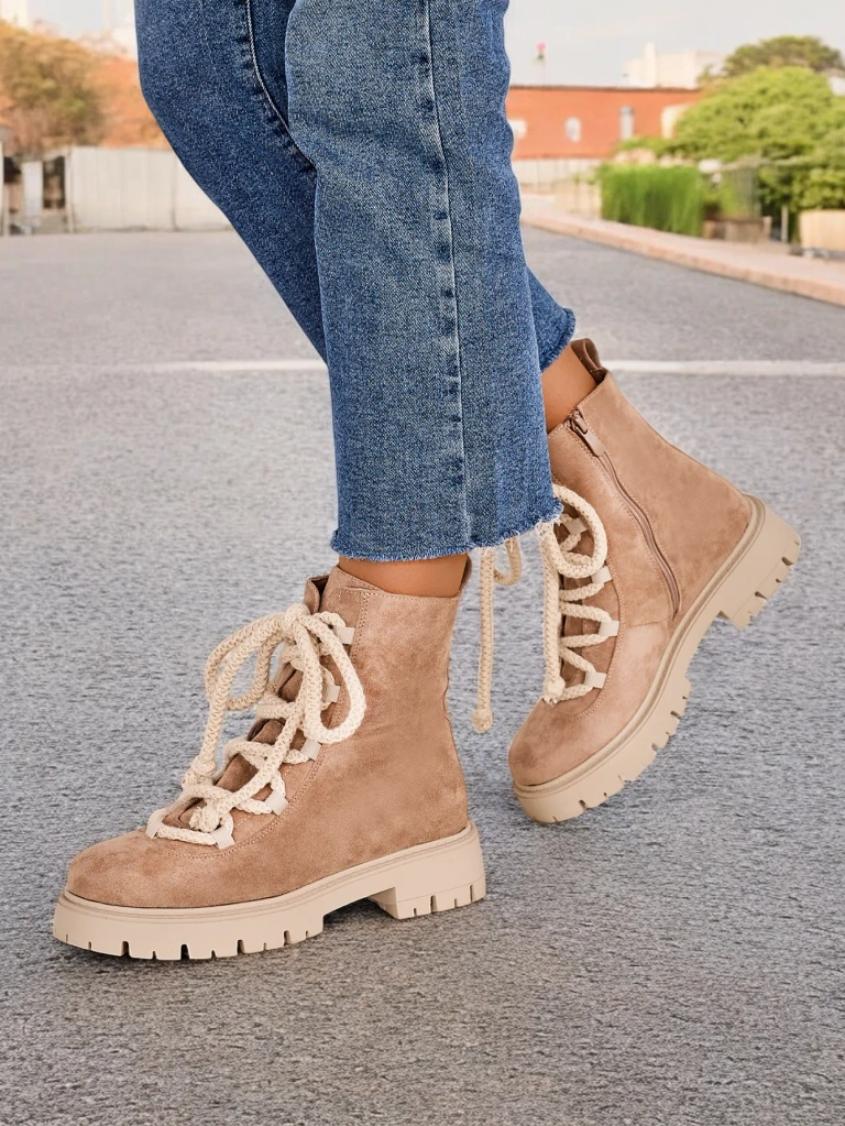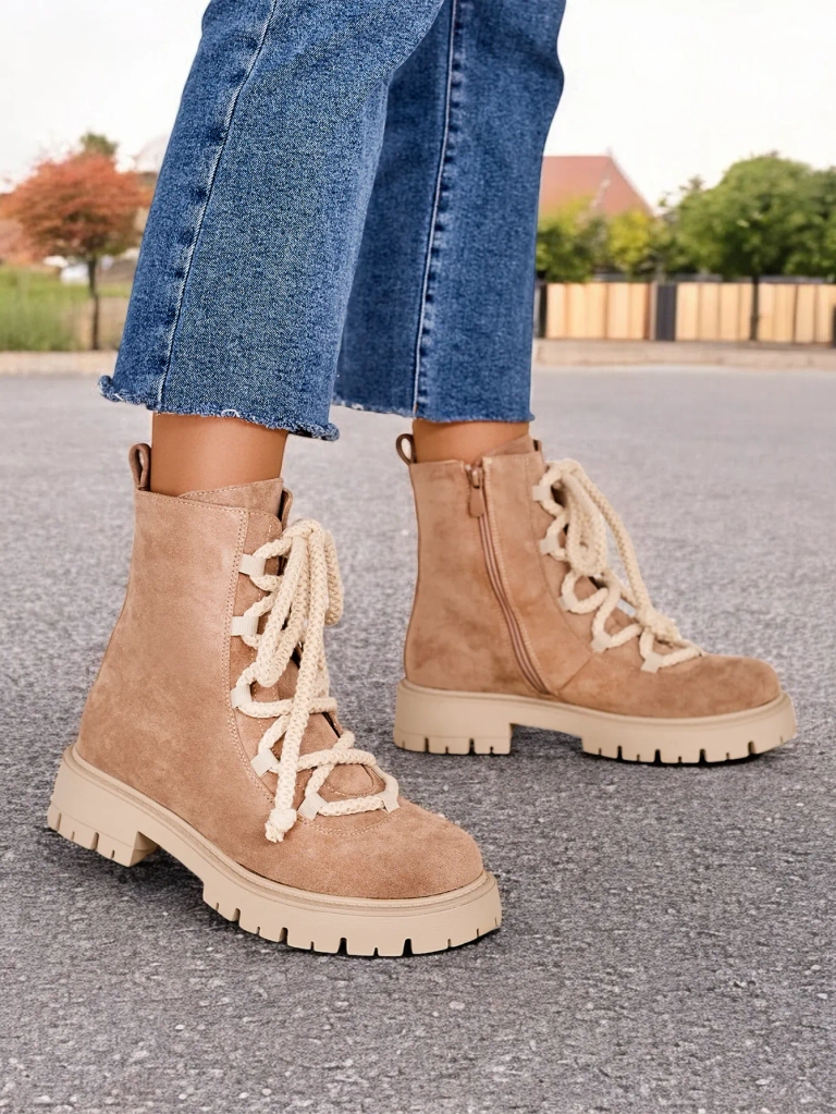 • Divatos fűzős bokacsizma rusztikus műbőrből készült. A cipő fűzős és cipzárral záródik. A modell vastag talppal és szőrme béléssel rendelkezik. Tökéletes az őszre!