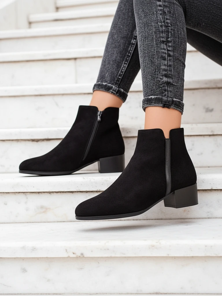 Az elegáns fekete színű női bokacsizmák ideális választás az őszi-téli szezonra. Kiváló minőségű ökológiai velúrbőrből készültek, nemcsak divatos megjelenést, hanem kényelmes viseletet is biztosítanak. A szintetikus talpbetét növeli a használat kényelmét, így alkalmasak egy hosszú munkanapra vagy társasági összejövetelekre. A 4 cm magas lapos sarok stabilitást és kényelmet biztosít, ami ideálissá teszi ezeket a bokacsizmákat a mindennapi használatra. Ezek a bokacsizmák könnyen kombinálhatók különböző alkalmakra. Íme három javaslat: 1. : Kombináld őket skinny farmerrel és oversized pulóverrel a mindennapokra. 2. : Párosítsd őket ceruzaszoknyával és klasszikus inggel, ami elegáns megjelenést kölcsönöz a munkahelyen. 3. : Viseld őket elegáns midi ruhával és blézerrel, hogy stílusos szettet hozz létre egy esti programhoz. A bokacsizmák kiváló állapotának megőrzése érdekében javasolt a száraz tisztítás és a száraz helyen való tárolás. Kerüld a túlzott nedvességgel és a közvetlen napfénnyel való érintkezést. A bokacsizmákra a szokásos visszaküldési szabályzat vonatkozik, ami nyugalmat biztosít a vásárlás során. Jelenleg a lapos sarkú bokacsizmák egyre népszerűbbek a divat világában, ötvözve a kifinomult stílust a kényelemmel. Ha beilleszted őket a ruhatáradba, az kiváló választás a következő hónapokra!