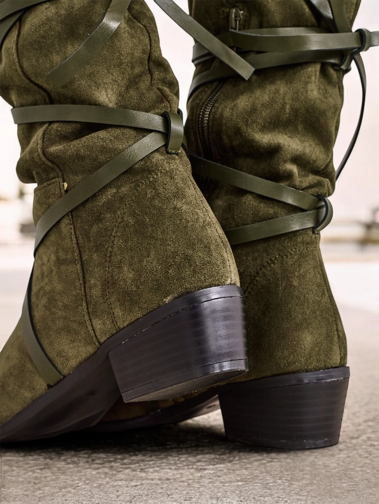 Odkryj wyjątkowe kozaki damskie Lavinia w kolorze camel, stworzone z wysokiej jakości skóry ekologicznej zamszowej. Delikatna faktura zamszu nadaje butom niezwykle eleganckiego i modnego wyglądu, a jednocześnie zapewnia lekkość i komfort codziennego noszenia. Materiał został wybrany z myślą o trwałości oraz łatwej pielęgnacji, co sprawia, że jest to idealna alternatywa dla tradycyjnej skóry naturalnej – jest odporny na zabrudzenia i odkształcenia, a przy tym przyjazny dla środowiska. Wnętrze butów wykończone zostało miękką wkładką ze skóry ekologicznej, która dopasowuje się do kształtu stopy i zwiększa wygodę użytkowania nawet podczas długich spacerów.Niski, płaski obcas (4,5 cm) dba o stabilność i wygodę, natomiast modne paski oplatające cholewkę inspirowane włoskim designem przyciągają wzrok i podkreślają kobiecość stylizacji. Dzięki średniej wysokości cholewce (35 cm dla rozmiaru 38) kozaki doskonale modelują nogę i pasują zarówno do spodni, jak i sukienek czy spódnic.- Lekkie, miękkie i przewiewne – sprawdzą się w jesienne i zimowe dni.- Dopasowują się do łydki, dzięki czemu są wygodne dla różnych typów sylwetek.- Ekologiczne materiały zapewniają komfort bez kompromisu dla środowiska.1. Styl boho – połącz kozaki Lavinia z długą, wzorzystą sukienką i dużym swetrem. Idealne na spotkania z przyjaciółmi.2. Elegancja na co dzień – noś je z ciemnymi rurkami i klasycznym płaszczem camelowym.3. Miejski szyk – zestaw z krótką spódnicą oraz golfem, dodając wełniany beret dla podkreślenia włoskiego stylu.- Czyścić miękką szczotką do zamszu lub wilgotną ściereczką.- Stosować specjalny spray do pielęgnacji eko-zamszu.- Przechowywać w przewiewnym miejscu, najlepiej z prawidłami zapobiegającymi deformacji. Kozaki camel Lavinia to absolutny hit sezonu – ciepły odcień brązu, płaski obcas oraz stylowe paski nawiązują do najnowszych włoskich trendów. Doskonały wybór dla kobiet ceniących niebanalne rozwiązania, wygodę i ponadczasowy styl.