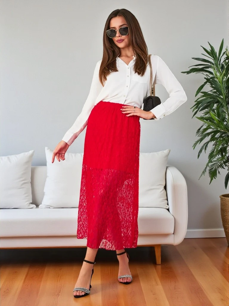 • Női midi szoknya könnyű anyagból. Modell bélés és külső réteg csipkével, rugalmas derékkal. Ideális az őszi szezonra! FIGYELEM: Mérési pontosság (+/-) 1 cm.
