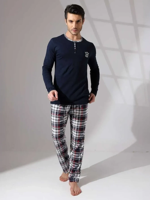 - Elegáns férfi pizsama egyedi mintával és kockás nadrággal. Magas minőségű pamutból készült, kényelmes alvást és stílusos megjelenést garantál. FIGYELEM: Mérési pontosság (+/-) 1 cm.