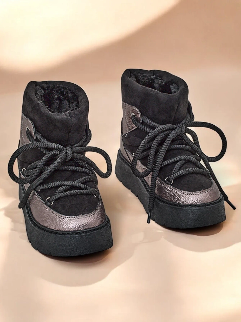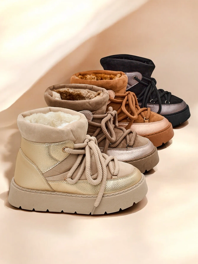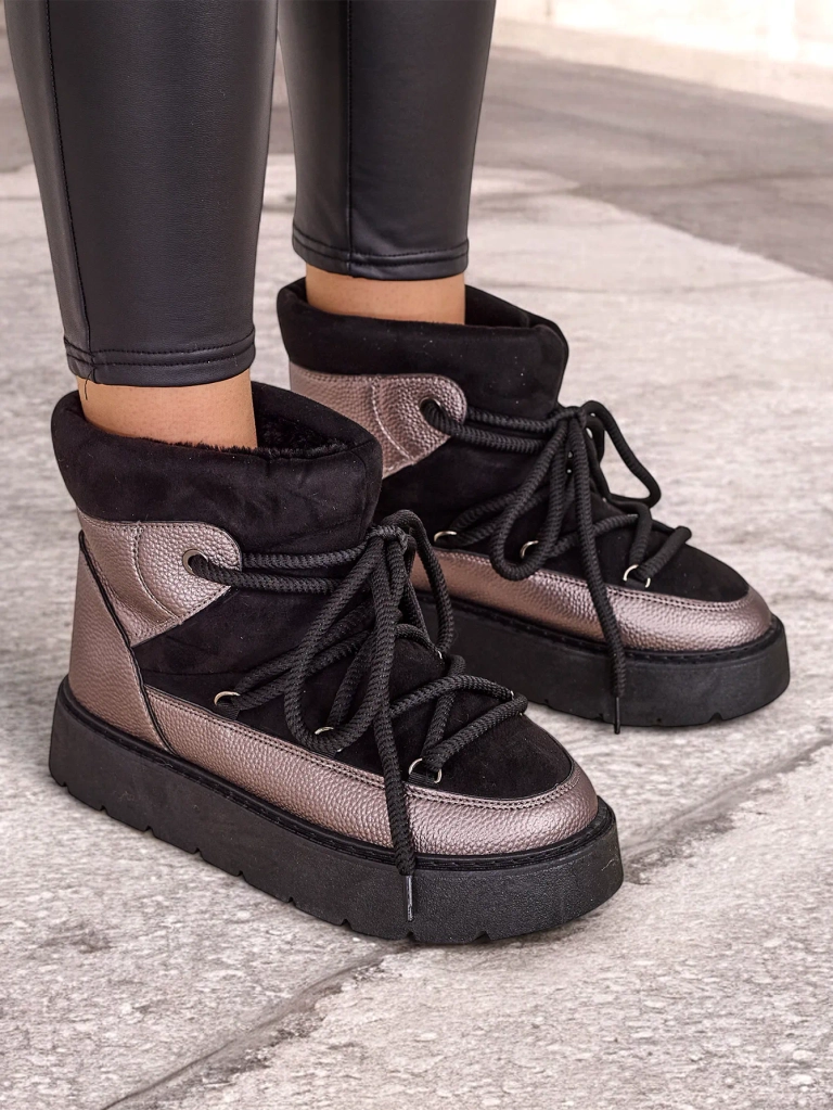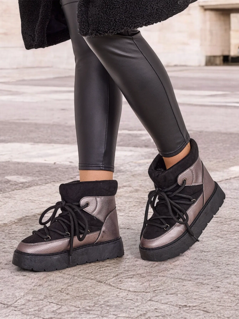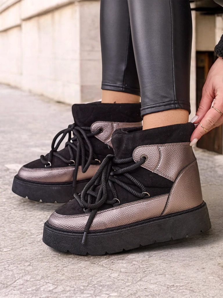 - Női hótaposó csizma, melynek szára öko bőr és öko szarvasbőr kombinációjából készült. Belül kellemes szőr, belebújós és fűzős cipő. Tökéletes a téli időszakra!