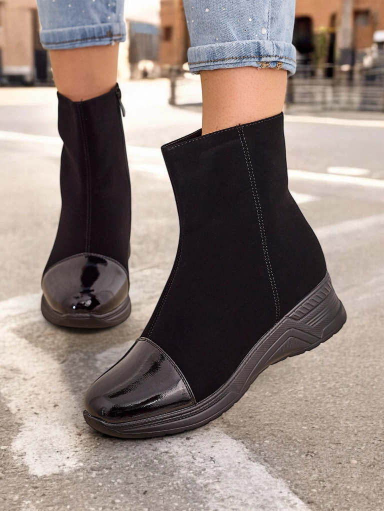 - Mesés női sarok csizma, matt öko bőrből készült, lakk orral. A belső rész kellemes prém anyaggal van bélelve. A modell cipzárral záródik. Tökéletes őszi outfithez!