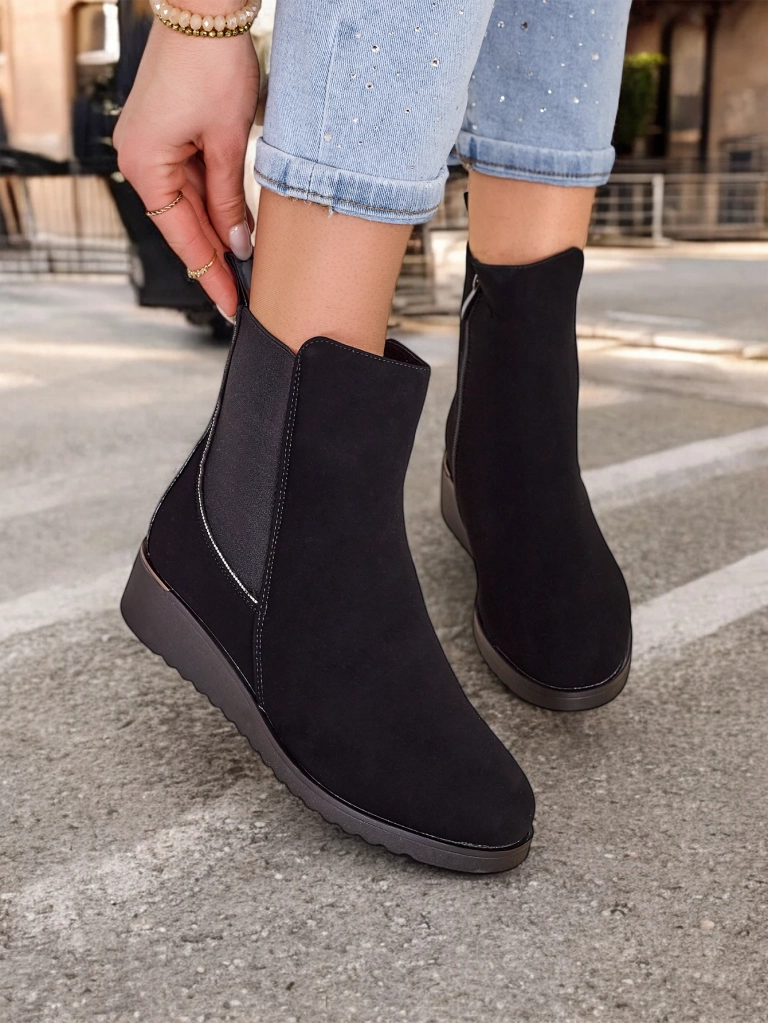 • Lélegzetelállító női bokacsizma cipő talppal, matt öko bőrből és fényes öko bőrből készült. Belső része kellemes szőrrel van bélelve. A modell cipzáras és díszített cirkóniával. Tökéletes őszi outfit-hez!