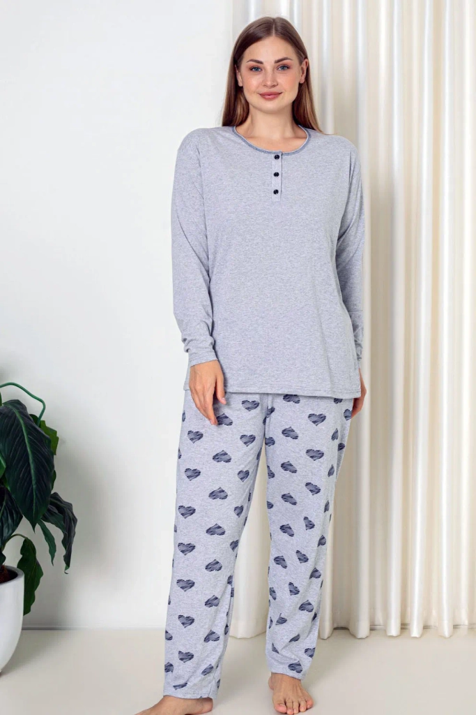 - Női 2 darabos pizsama készlet pamut anyagból, díszes szív mintával. A készlet tartalmaz egy hosszú ujjú felsőt és egy nadrágot, melynek gumis dereka és egyenes lába van.