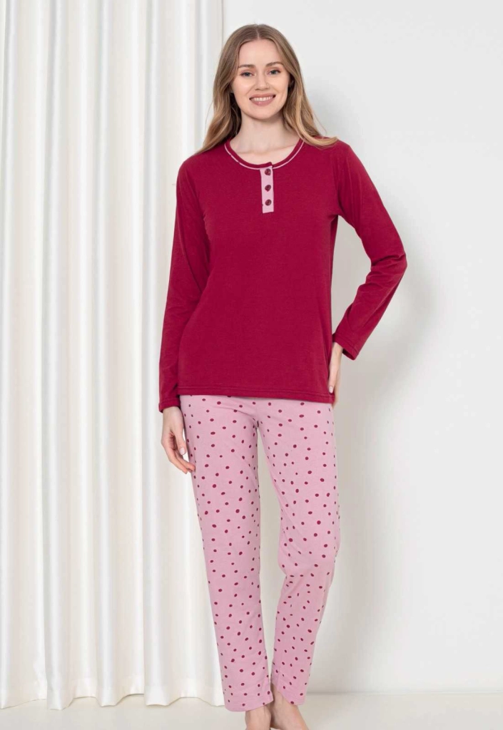 - Női 2 részes pizsama szett hosszú ujjakkal és hosszú lábakkal, pamut anyagból készült. A modellt minta díszíti. Tökéletes otthoni kényelmes estékhez! MEGJEGYZÉS: Mérési pontosság (+/-) 1 cm.