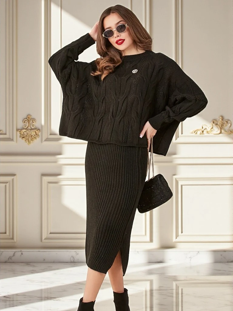 - Női szett kellemes anyagból készült. Pulóver hosszú ujjakkal és kerek nyakkivágással, valamint midi szoknya, melyet rugalmas derékpánttal láttak el. Tökéletes téli megjelenés! MEGJEGYZÉS: Méréspontosság (+/-) 1 cm.