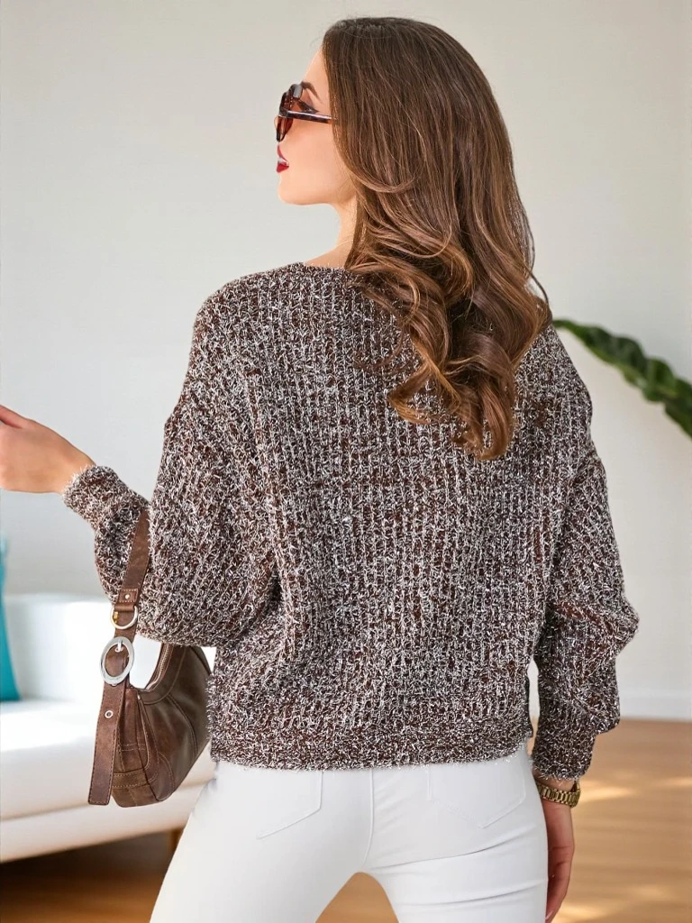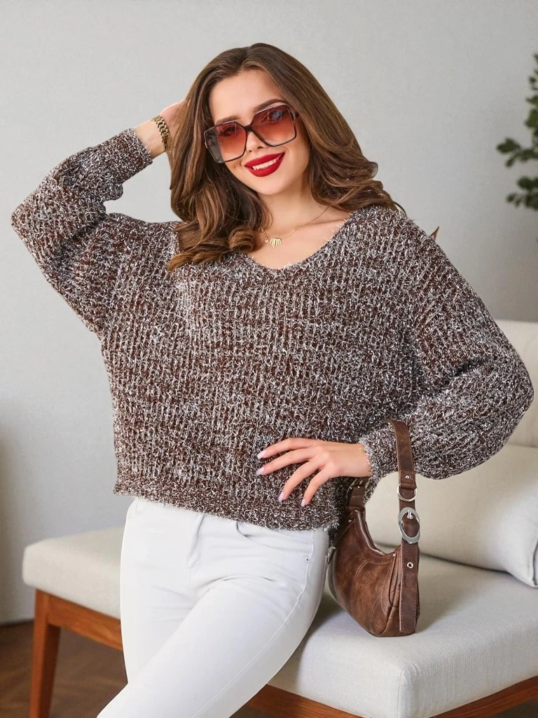 - Ez a stílusos pulóver a kényelem és a báj esszenciája. Puha anyagból készült, V nyakú és hosszú ujjak jellemzik. A laza fazon és a fényes szál egyedi bájt ad neki!