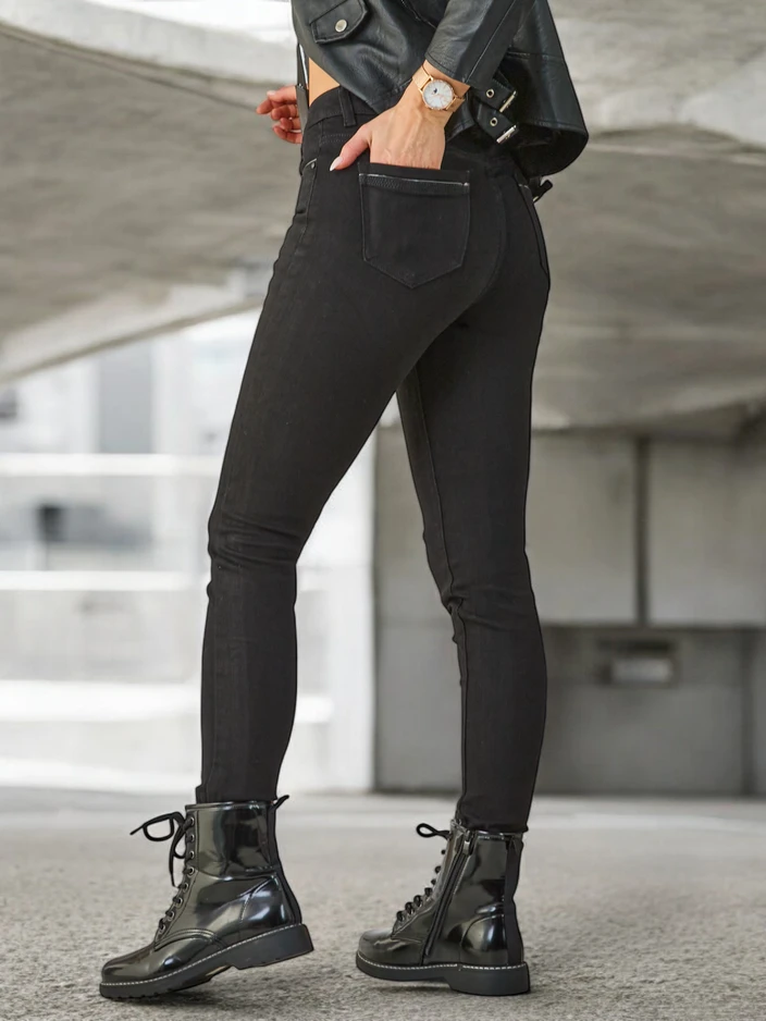 - Női szűkített denim nadrág pamut anyagból. Középmagas derék, gombbal és cipzárral záródik. Két pár zseb - hátul és elöl.