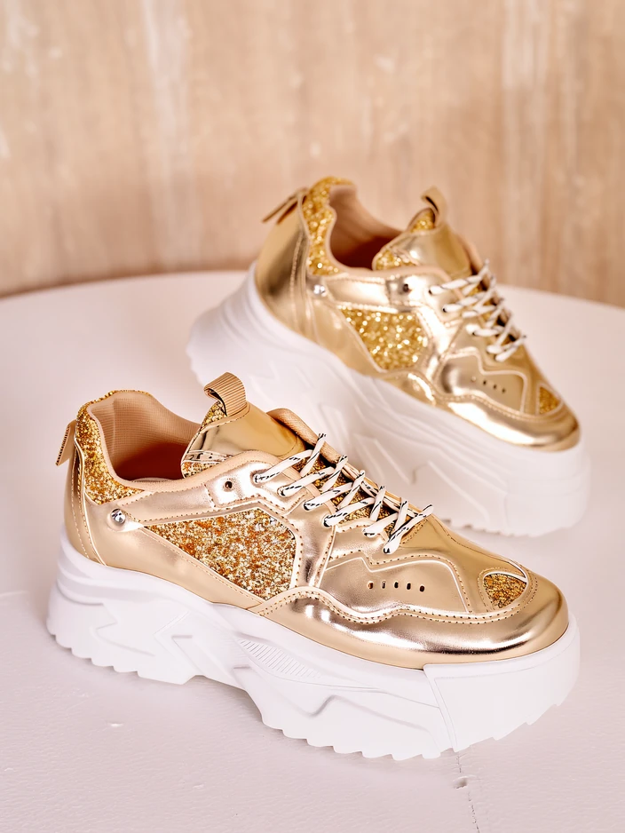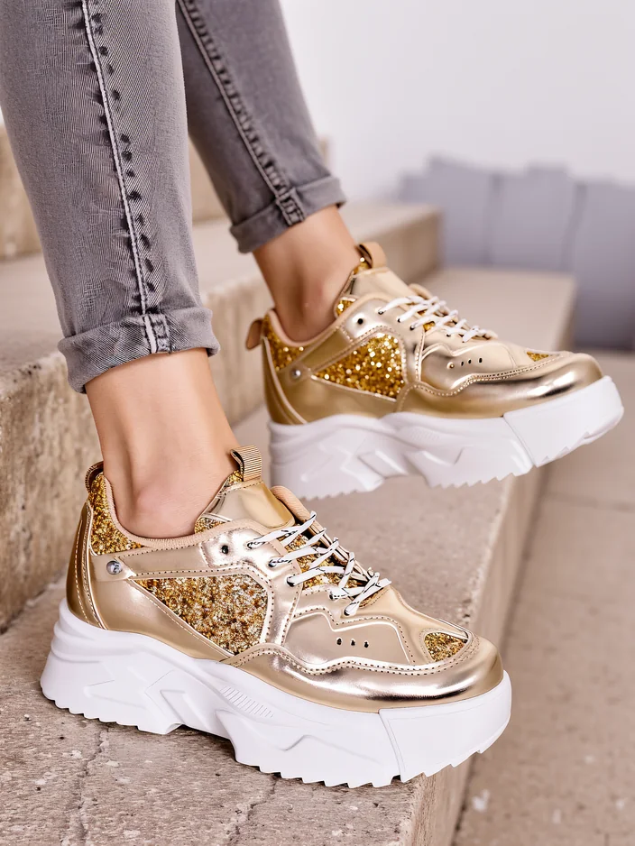 • Női sportcipők sneaker stílusban, lapos talppal. Öko-bőrből készült csillogó díszítésekkel. A talpbetét öko-bőr. Remek kiegészítő a mindennapi lazább ruhatáradhoz!