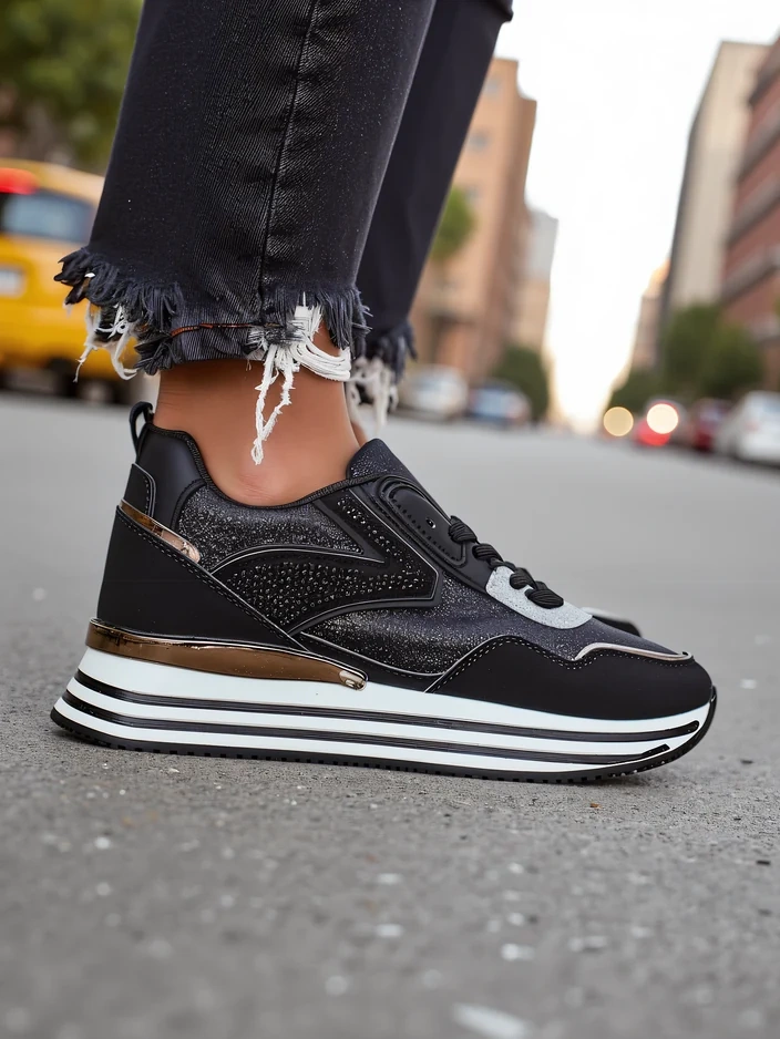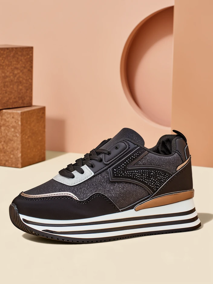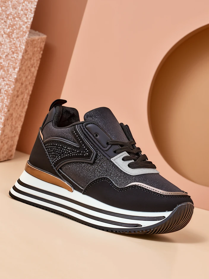 - Női sportcipők sneaker stílusban, vastagabb talppal. Eko-bőrből és csillogó anyagból készült, textil talpbetéttel. Remek kiegészítője a mindennapi hétköznapi ruháidnak!