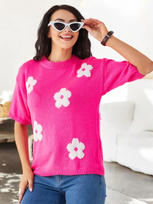 - Divatos női pulóver vékony, puha anyagból, amely kényelmet biztosít viselés közben. A modell kerek nyakkivágással és rövid ujjal rendelkezik. Továbbá diszkrét virágmintával díszített, ami varázst és nőiességet kölcsönöz.