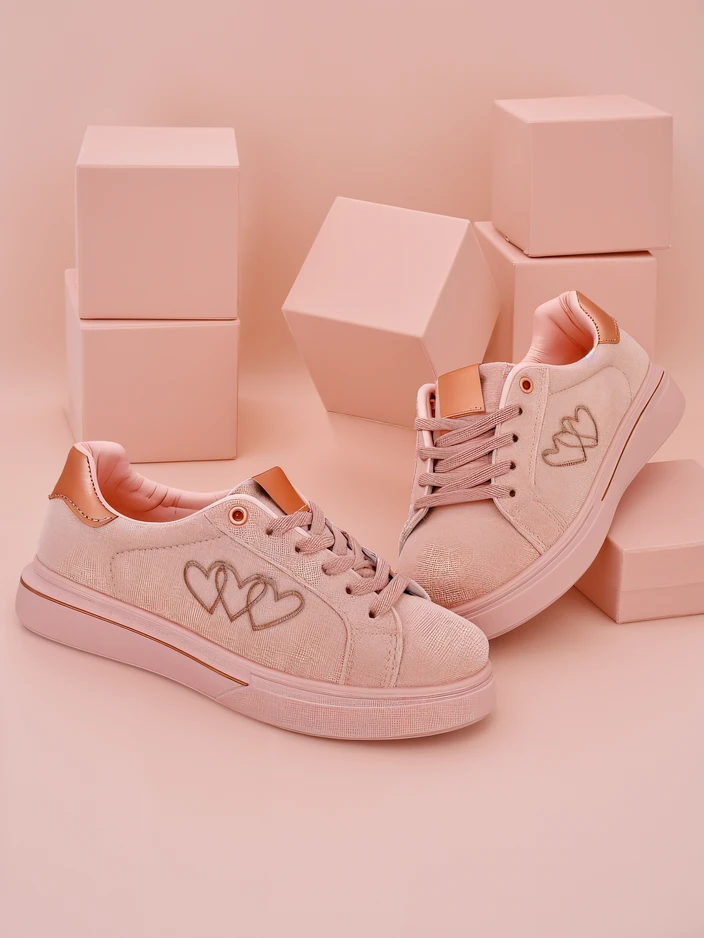 - Női sportcipők lapos talppal, öko-zsákszövet felső résszel. A modell öko-bőr talpbéléssel rendelkezik, és hímzett szívecskék díszítik. Párosítsd széles nadrággal és inggel!