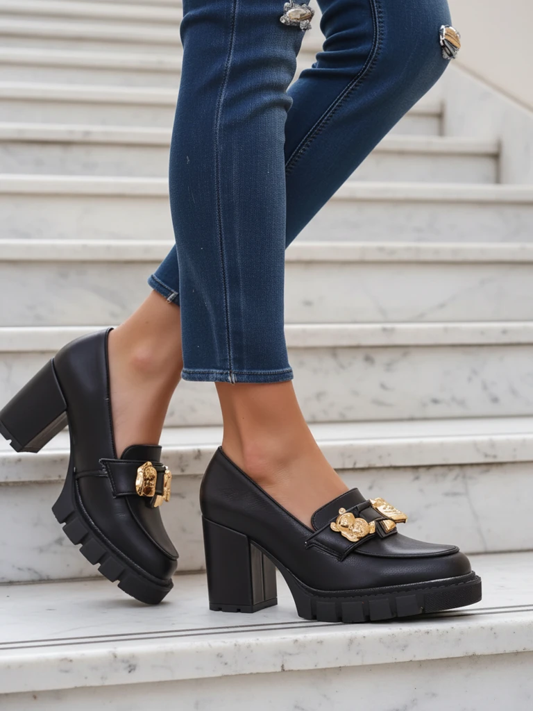 Klasszikus női, sarokkal ellátott mokaszin. A modell teljes egészében öko bőrből készült. A cipő finom díszítéssel rendelkezik a felsőrészen. Tökéletes alap a mindennapokra!