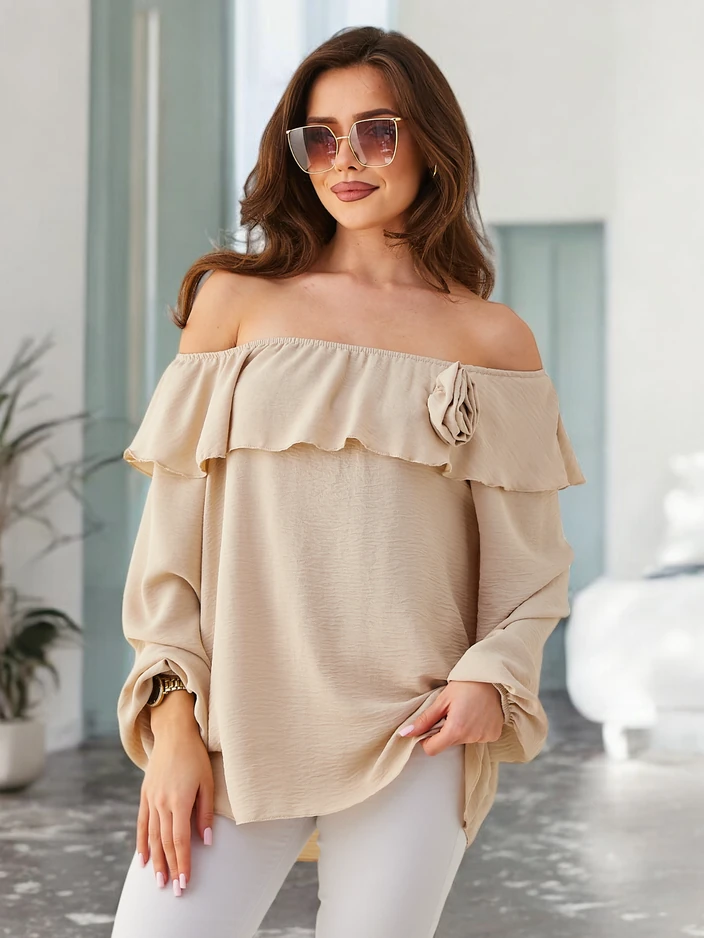 - A vállnélküli, fodros dekoltázsú felső elegáns és nőies lehetőség bármely alkalomra. Az dekoltázsnál található gumírozás és a hosszú ujjak megfelelően illeszkednek a sziluettre, kényelmet és mozgásszabadságot biztosítva. A finom fodor könnyedséget és bájt