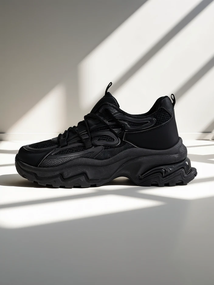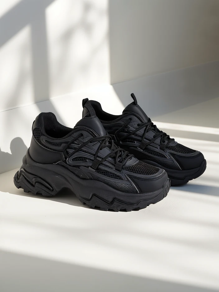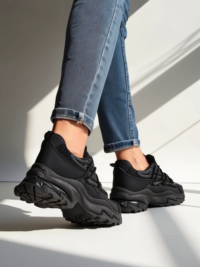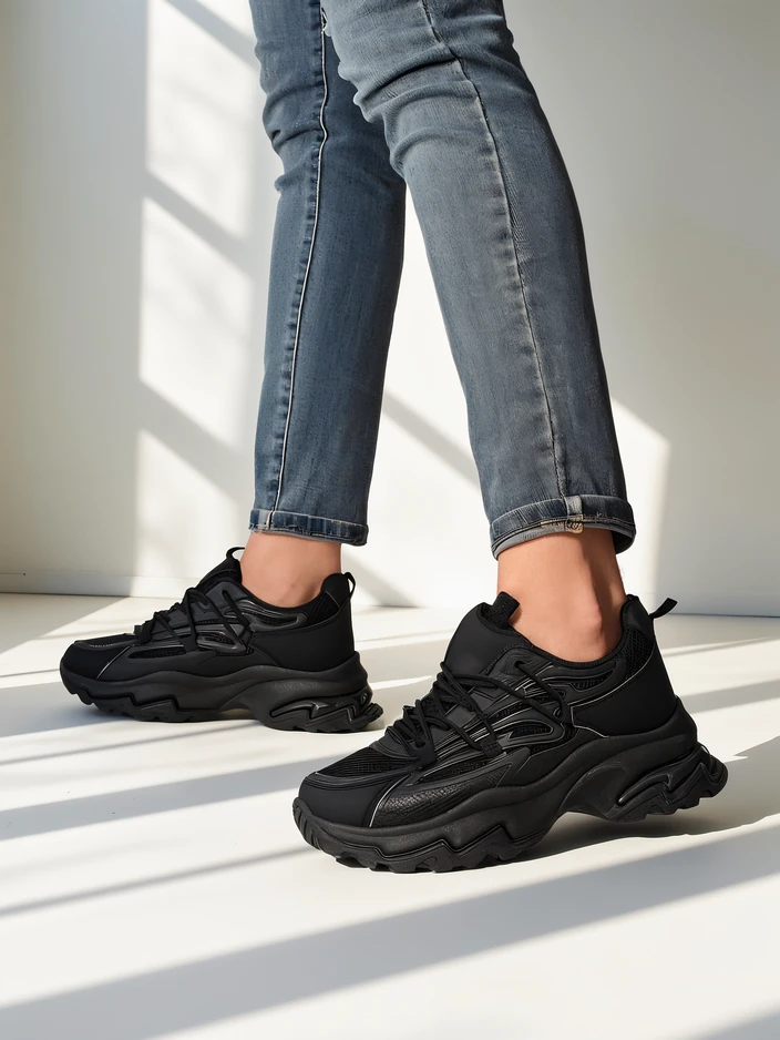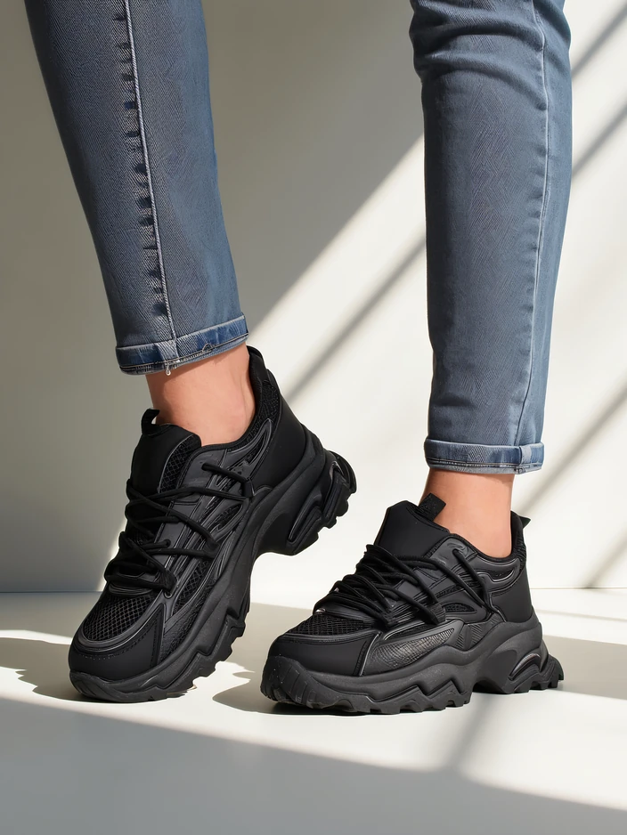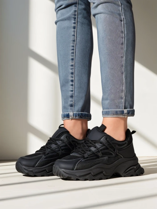 - Női sportcipők lapos talppal, öko-bőrből és szövetből, gumi betétekkel készítve. A modell jellemzője a szövetbetét és a vastagabb talp. Párosítsd széles nadrággal és inggel!