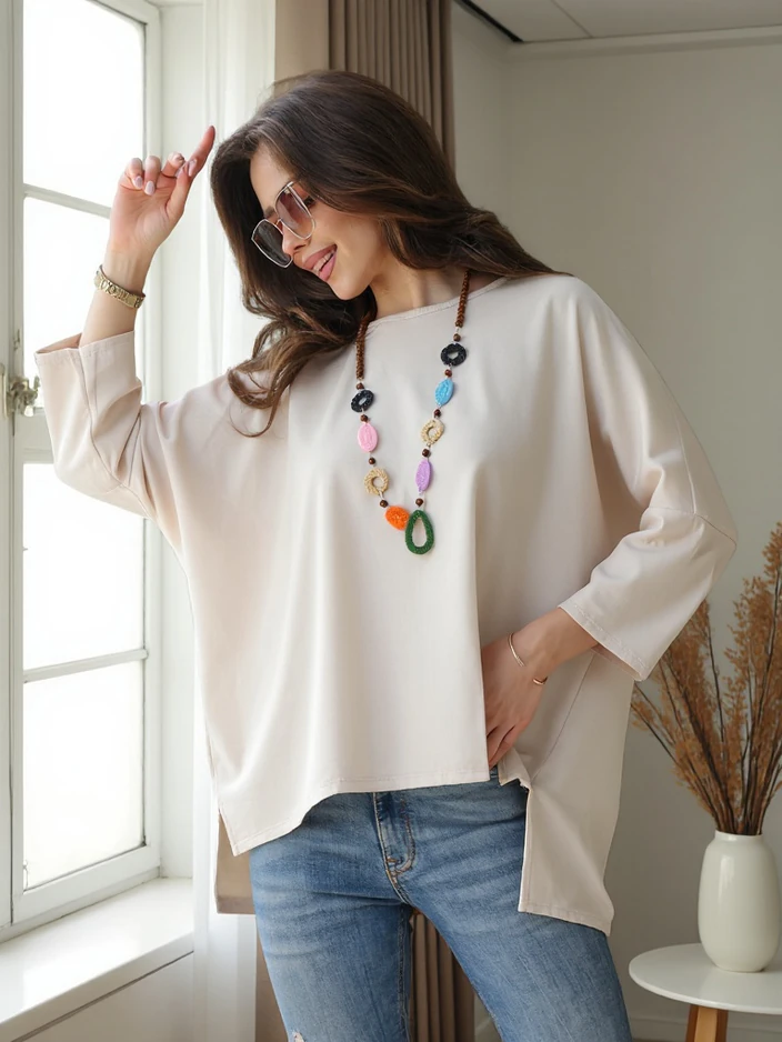 - Eredeti női blúz kerek nyakkivágással, kellemes és puha anyagból készült. Ez a termék laza szabású, 3/4 hosszú ujjú. Ezenkívül egy nyaklánc is tartozik a szetthez. Ideális választás stílusos outfitek létrehozásához!