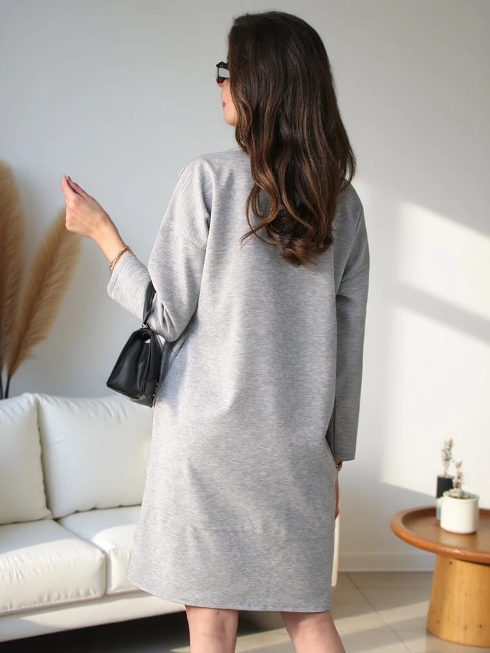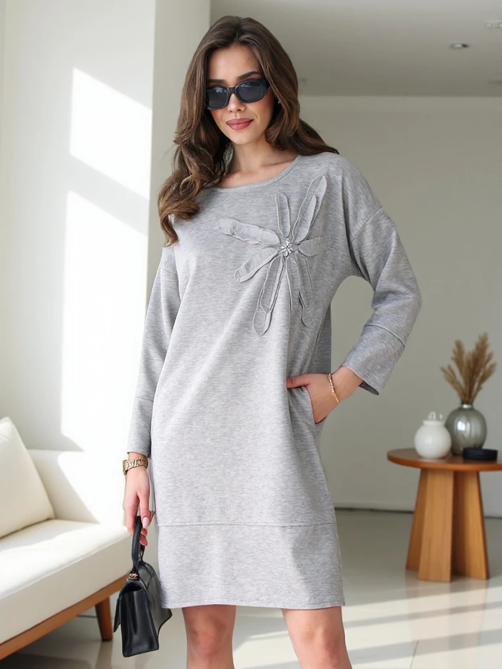 • Hétköznapi női térd-length ruha 3/4-es ujjakkal és kerek nyakkivágással. A modellt dekoratív virág díszíti. Ez az idény kötelező! MEGJEGYZÉS: A mérések pontossága (+/-) 1 cm. A méretek lapos állapotban mérve.