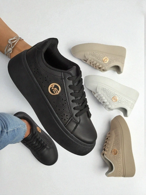 Női, platformos, áttört sneakers eco bőrből és textil betéttel, mely a kényelmet a divatos stílussal ötvözi. Tökéletes a mindennapokra, könnyedséget és kényelmet biztosít, a finom design pedig eleganciát kölcsönöz minden összeállításnak.