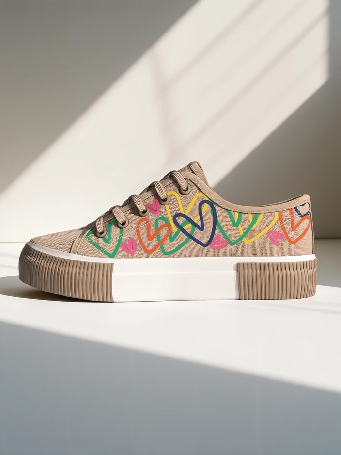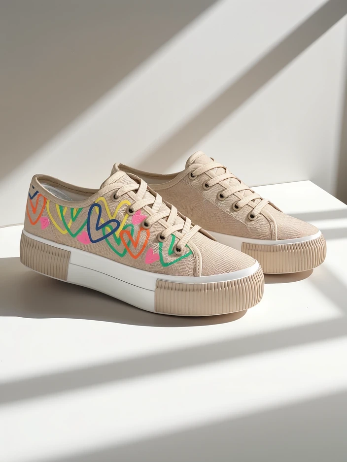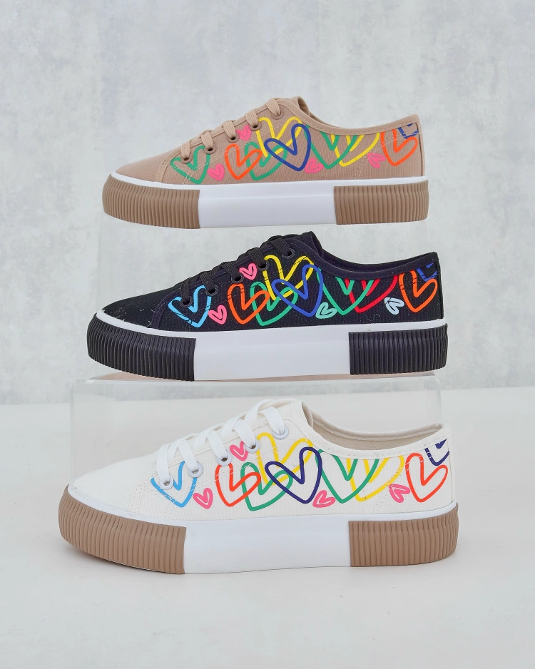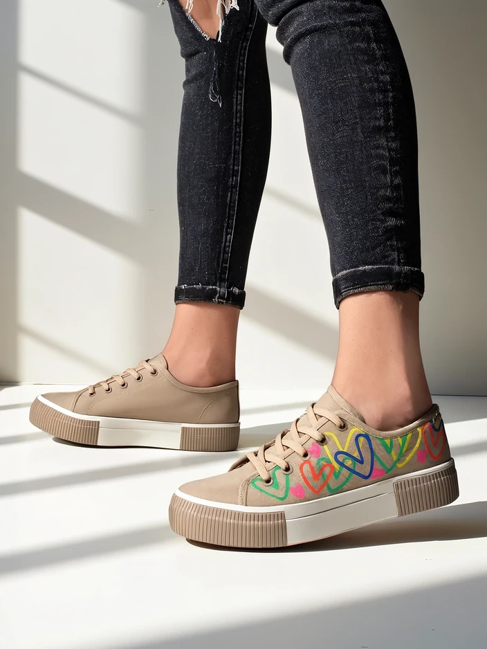 - Női edzőcipő szövetanyagból készült. A felsőrész fűzős és szívmintával díszített. A talpa klasszikus gumiból készült. Ezek a cipők nagyszerűek lesznek a mindennapi viselethez!