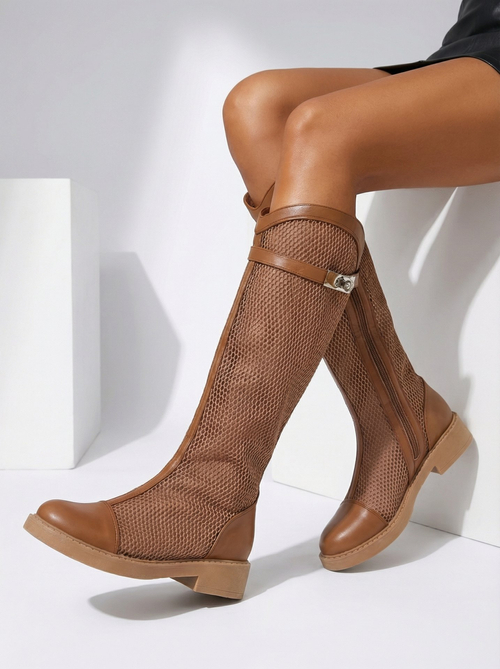 • Egyedi női bokacsizma háló-szerű anyagból és öko-bőrből, perforált felülettel és öko-bőr talppal. A modell cipzárral rögzített. Tökéletes őszies öltözékekhez!
