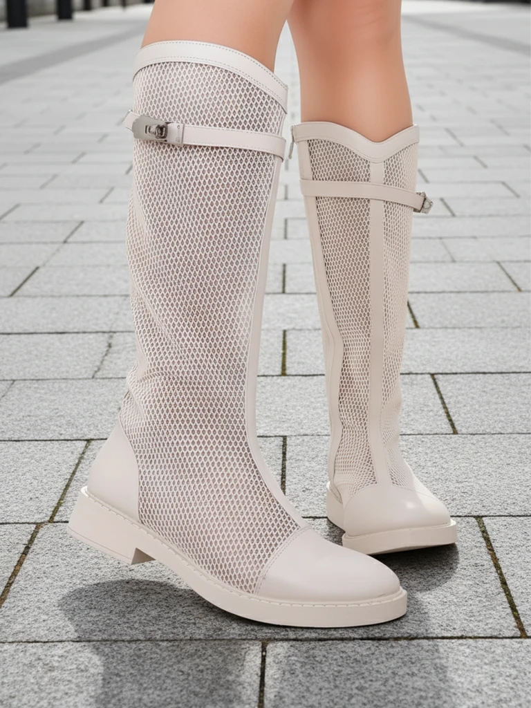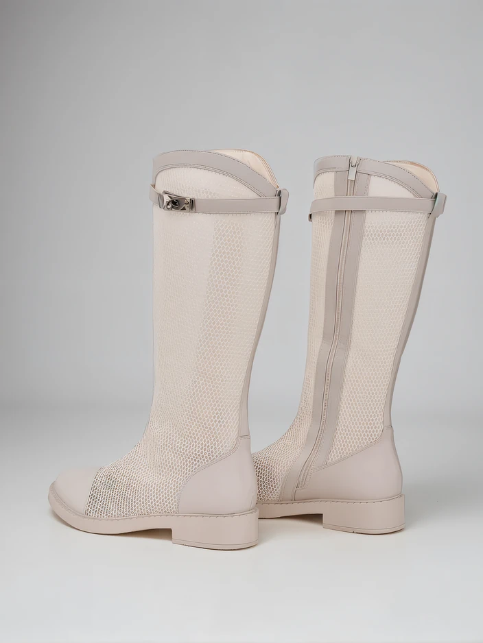 • Egyedi női bokacsizma háló-szerű anyagból és öko-bőrből, perforált felülettel és öko-bőr talppal. A modell cipzárral rögzített. Tökéletes őszies öltözékekhez!