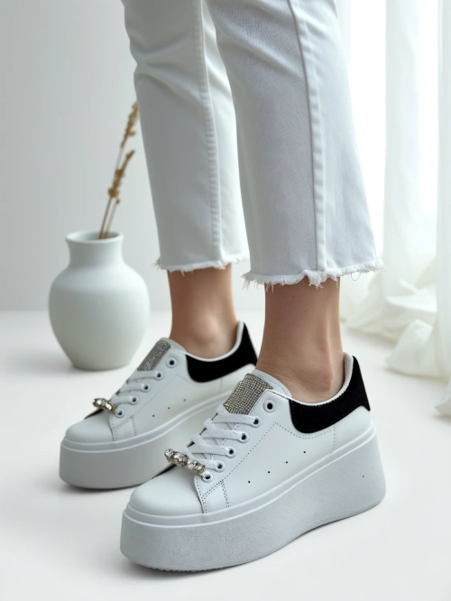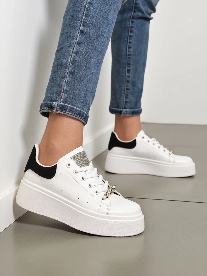 - Elegáns fehér cipők csillogó fémes részletekkel. Cipők öko-bőrből és szövet betétekből készülnek. Tökéletes a hétköznapi öltözékekhez.