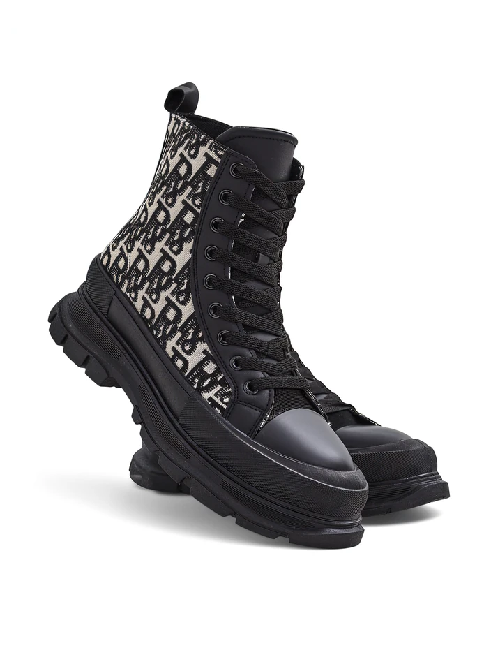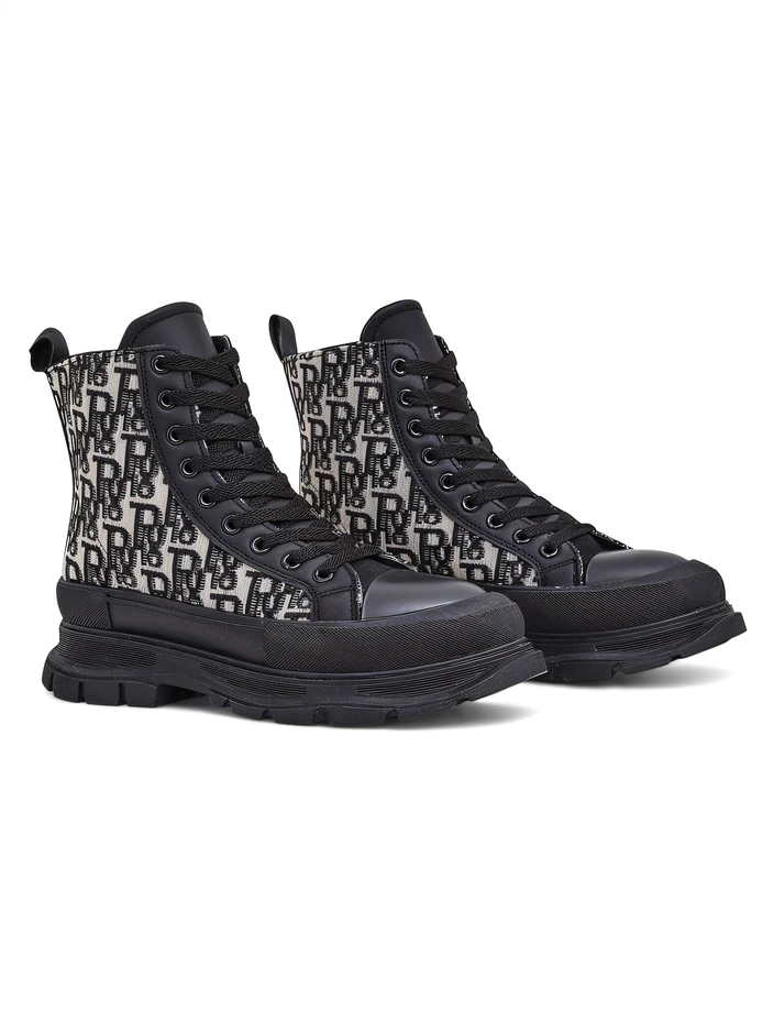 - Csodálatos női bokacsizma lapos sarkú, öko-bőrből és nyomtatott szövetből készült. A belső része szövettel bélelt. Fűzős modell.