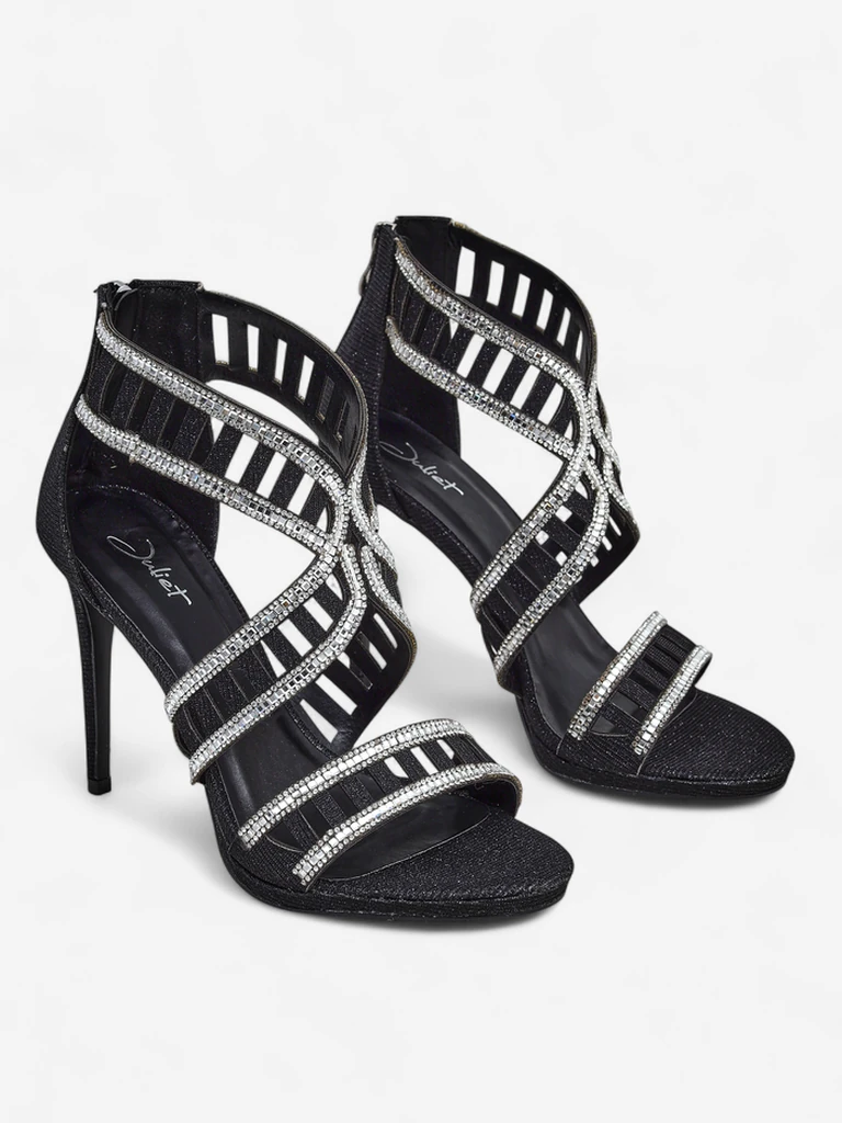 - Magassarkú szandál öko bőrből, szövetből és öko bőr talpbetétből. A felsőrész díszes pántokból és cirkóniákból áll. A stílus és a kényelem kombinációja. A tűsarok finom eleganciát kölcsönöz, a cipzár pedig megkönnyíti a felvételt. Tökéletes választás esté