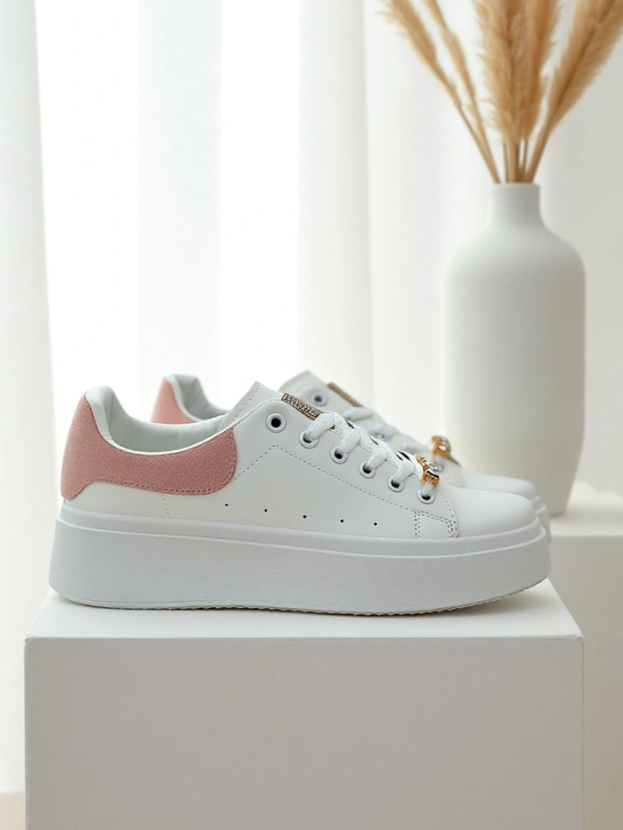 - Elegáns fehér sportcipők csillogó fémes részlettel. Öko-bőr és szövetbetétekből készült lábbeli. Tökéletes a hétköznapi összeállításokhoz.