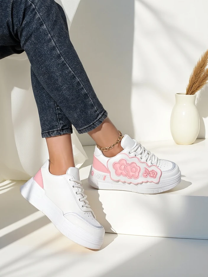 - Női tornacipő öko-bőrből, szövet talpbetéttel, platformon, amely a kényelmet stílusos divattal ötvözi. Tökéletes mindennapi viseletre, könnyedséget és kényelmet biztosít, miközben a letisztult dizájn eleganciát kölcsönöz bármilyen öltözetnek.