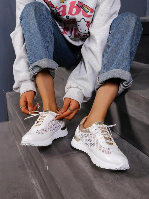 - Eredeti női sportcipő lapos talpon - a stílus és a kényelem tökéletes kombinációja. A cipők öko-bőrből és hálóból készültek. Fűzős modell, textil béléssel. Ideális aktív egyének számára!