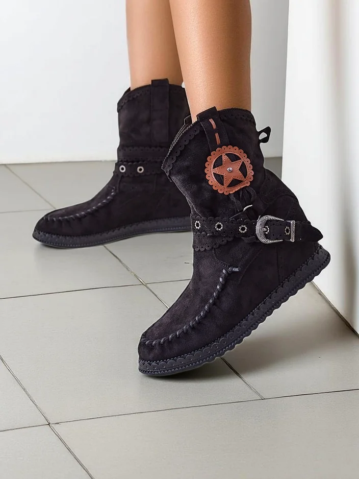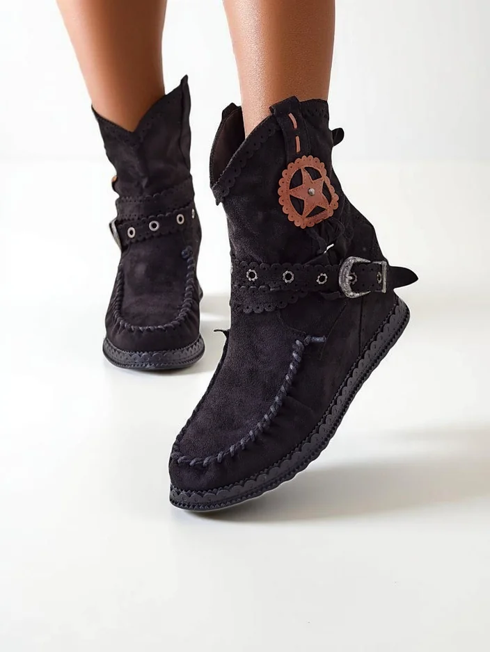 - Csodálatos női bokacsizmák alacsony, rejtett wedge, öko-suede-ből készült. A talpbetét öko-bőr. Slip-on modell, csattal díszítve. Tökéletes tavaszi öltözetekhez!