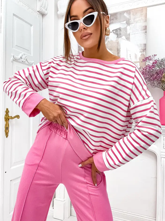 - Női szett kellemes anyagból, csíkos mintával. Pulóver hosszú ujjakkal, kapucni nélkül. Tréningnadrág rugalmas derékkal és 2 zsebbel. Ideális választás a mindennapi viselethez!