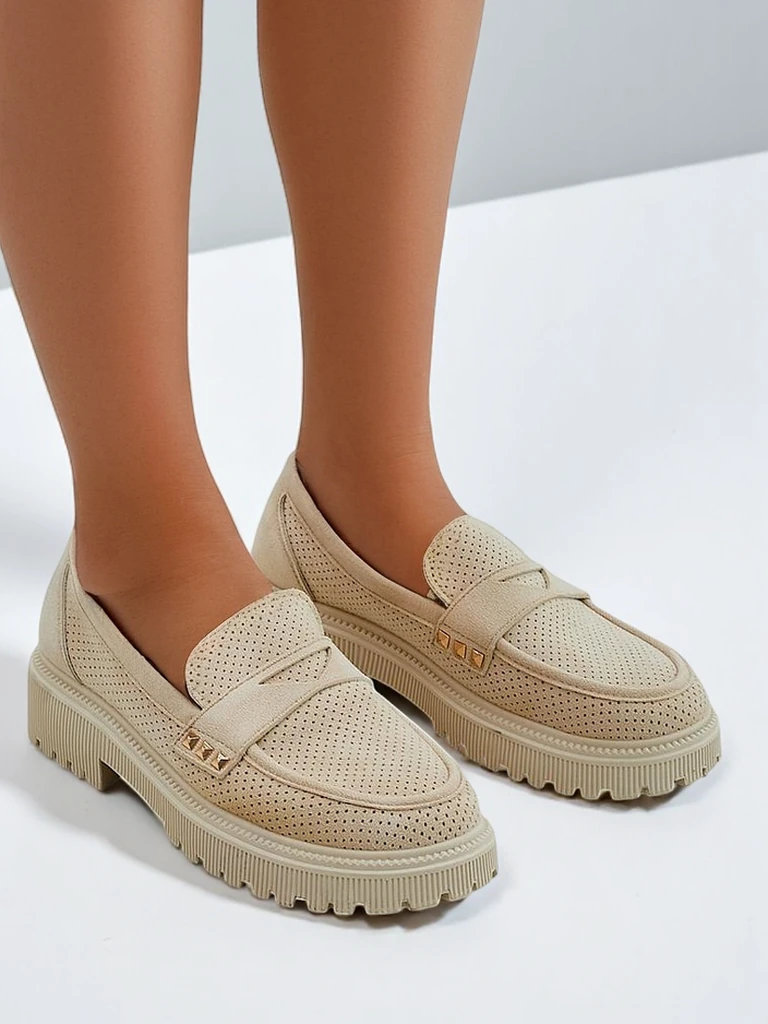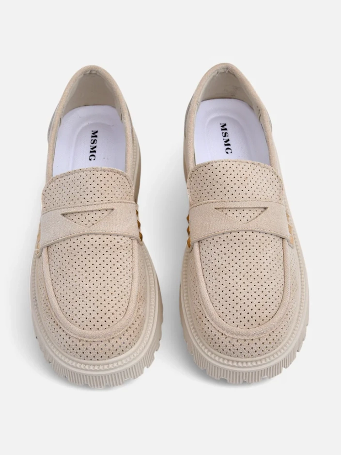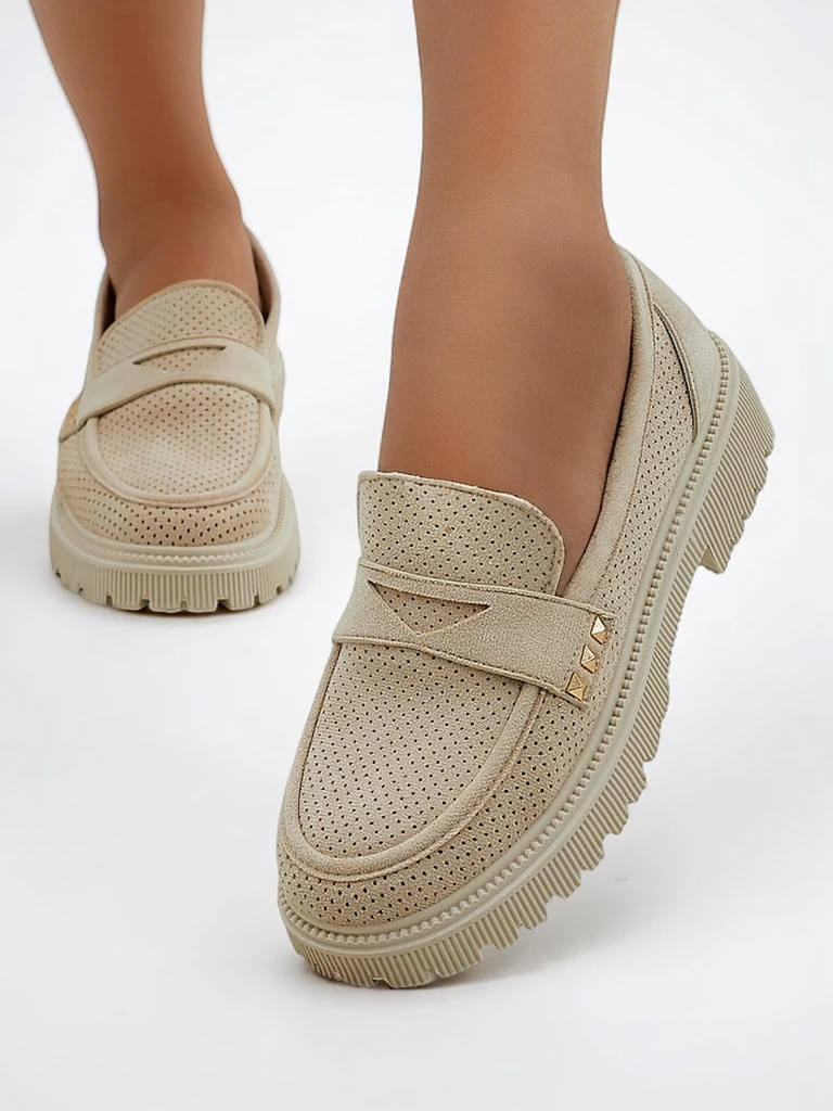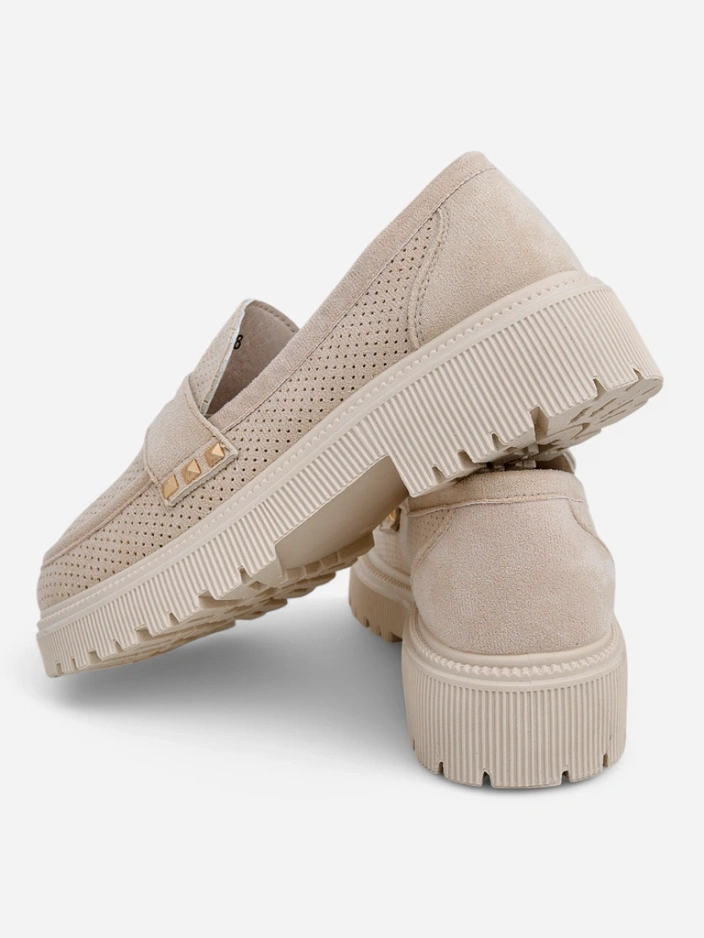 • Világos női mokaszin lapos talpon. A modell laza stílusú, öko-bőr nubukból készült, öko-bőr béléssel. Tökéletes tavaszi ruhákhoz!.