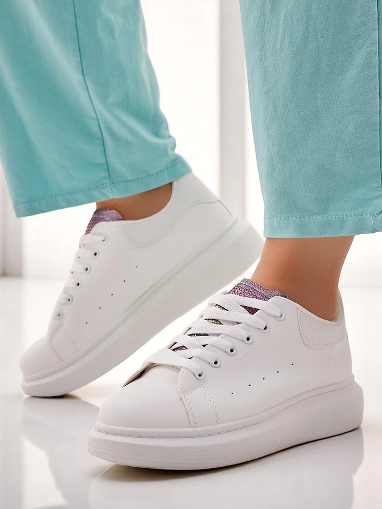 Fenomenalne sneakersy damskie na platformie - perfekcyjne połączenie stylu i komfortu. Obuwie wykonane z eko skóry. Model sznurowany, posiada eko skórzaną wkładkę. Idealne dla aktywnych osób!