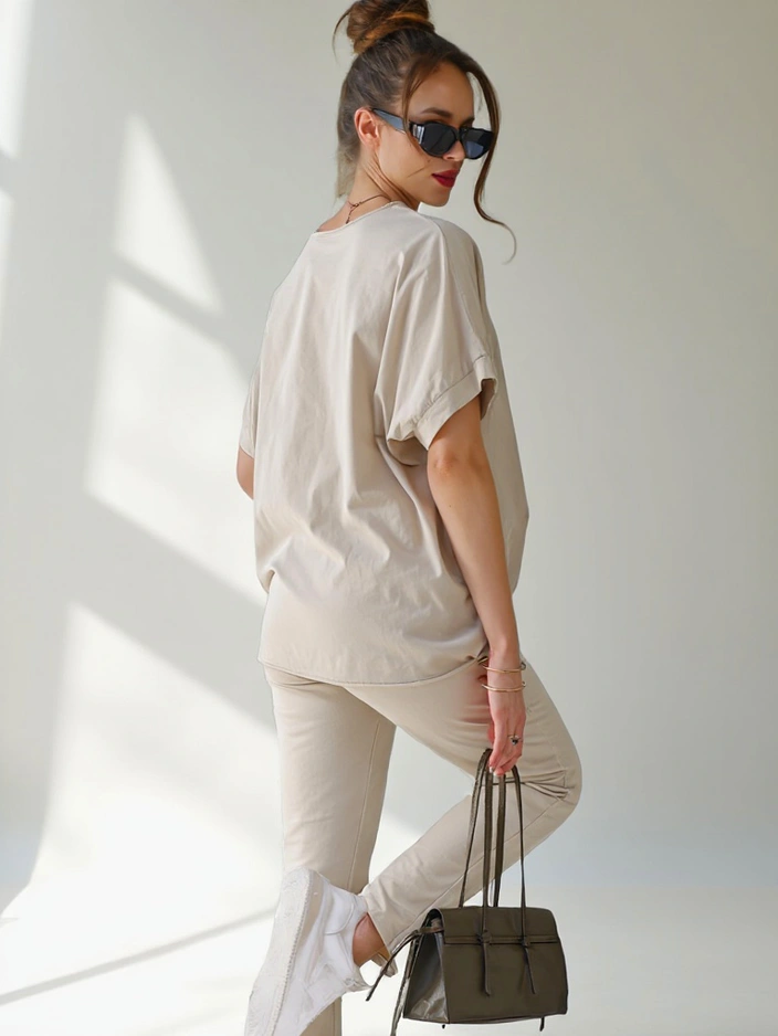 • Női laza készlet kellemes anyagból. A felső pulóver stílusú, rövid ujjakkal és kerek nyakkivágással rendelkezik. Egyenes nadrág rugalmas derekúval. Ideális azok számára, akik a kényelmet értékelik.