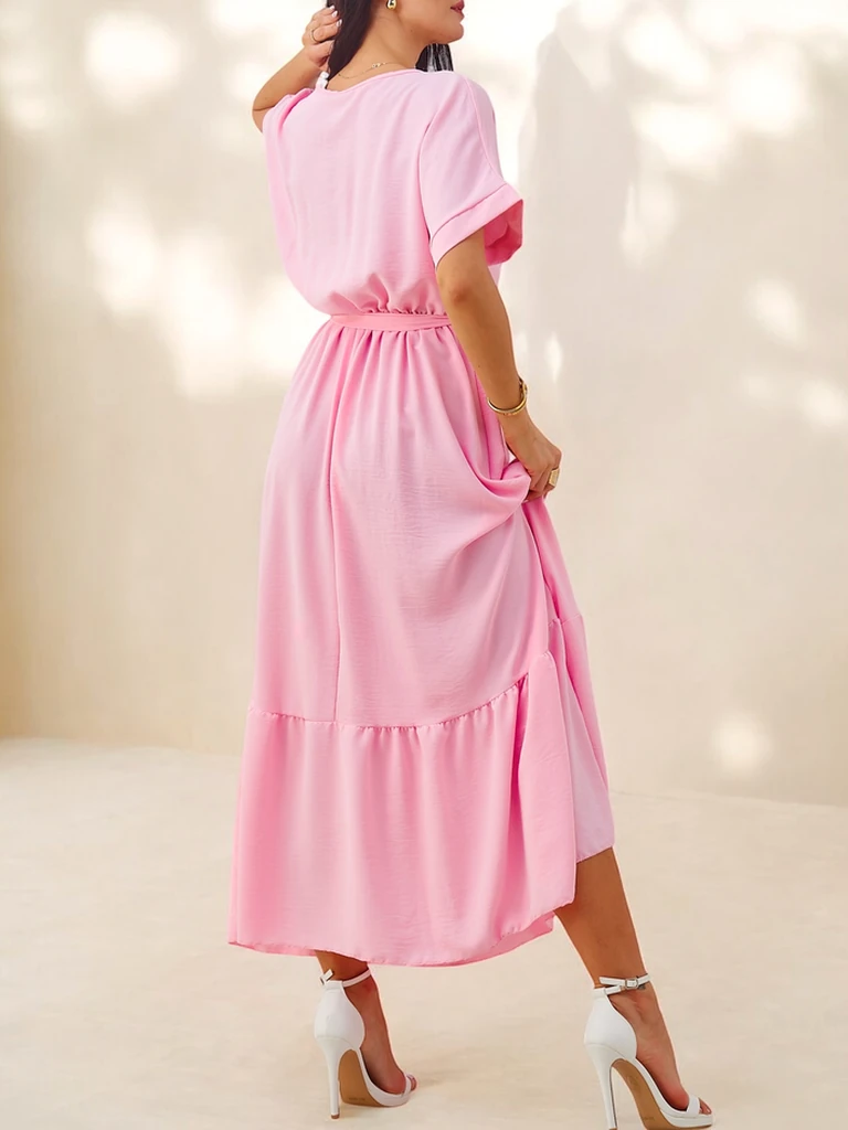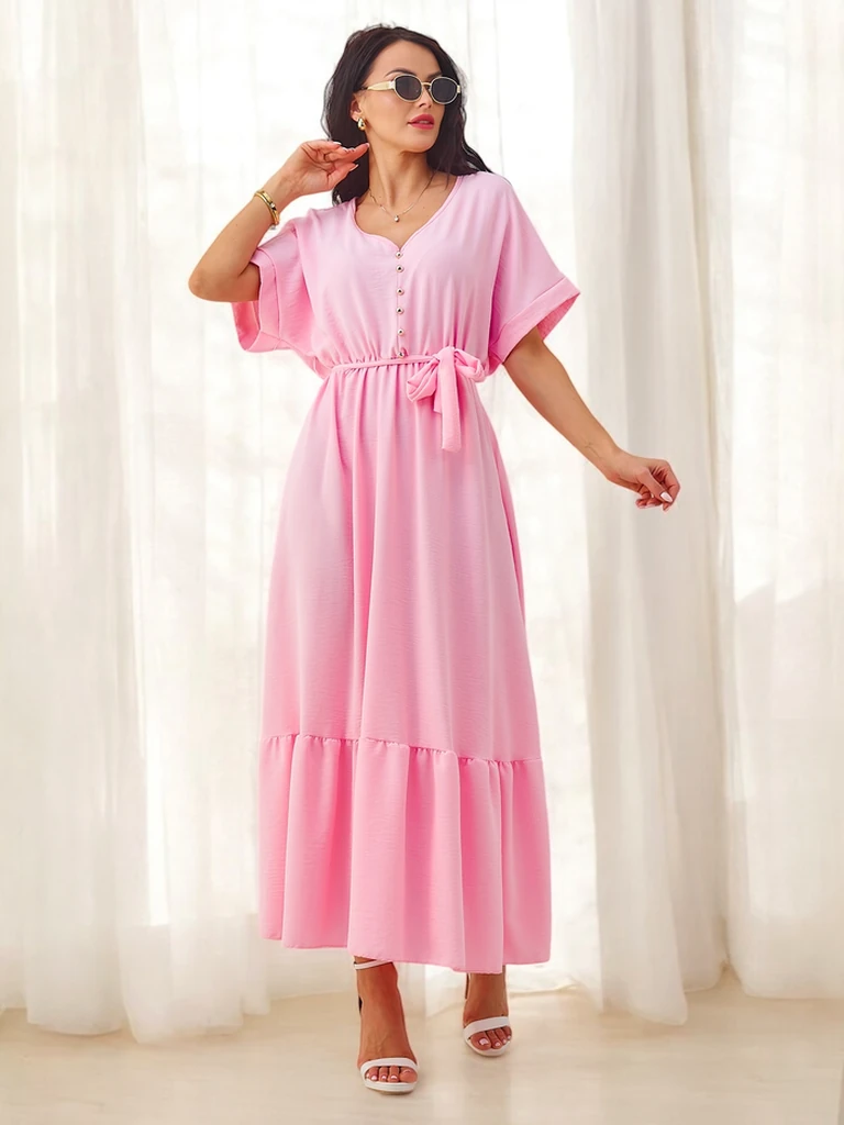 - Női midi ruha rövid ujjal, dísz gombokkal, övvel és V-nyakkal elegáns és nőies választás bármilyen alkalomra. Kiugtatja a sziluettet, ötvözve a klasszikus szabást a divatos részletekkel.