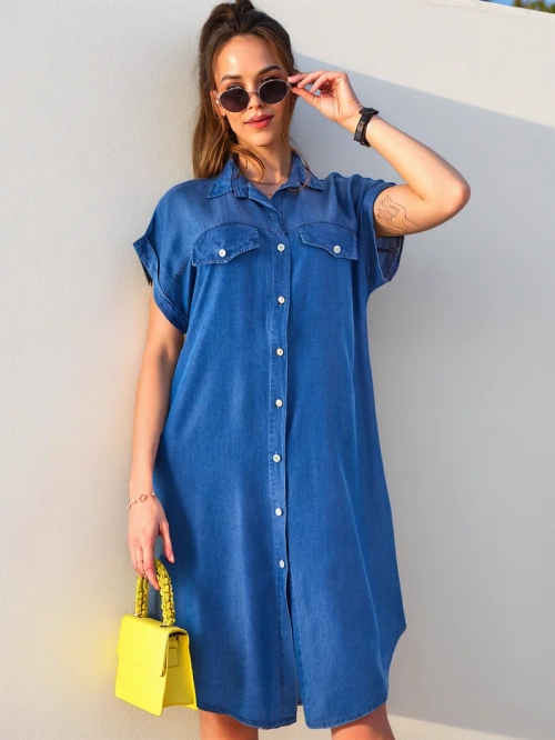 - Egyszerű női tunika ruha típusú farmer V-dekoltázsos és rövid ujjú. Kellemes anyagból készült. Érezd a tavaszi hangulatot vele!